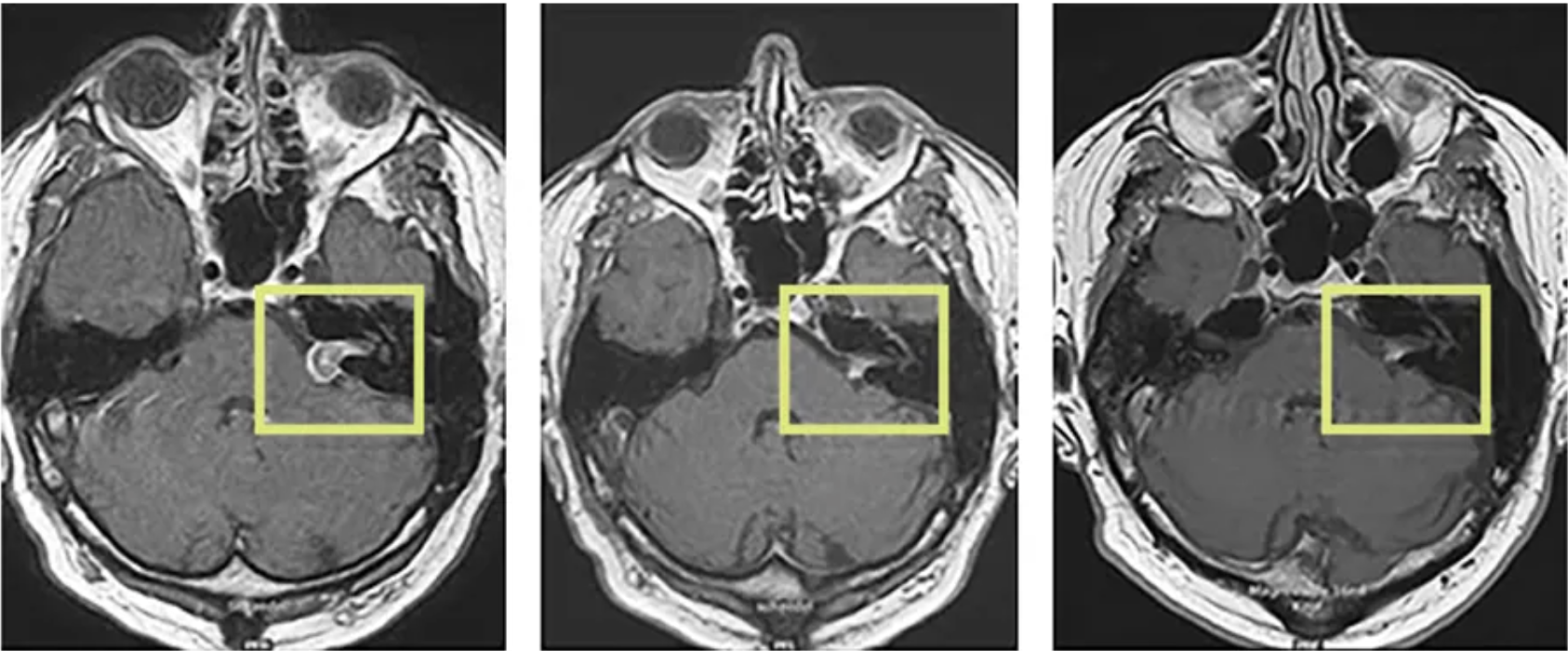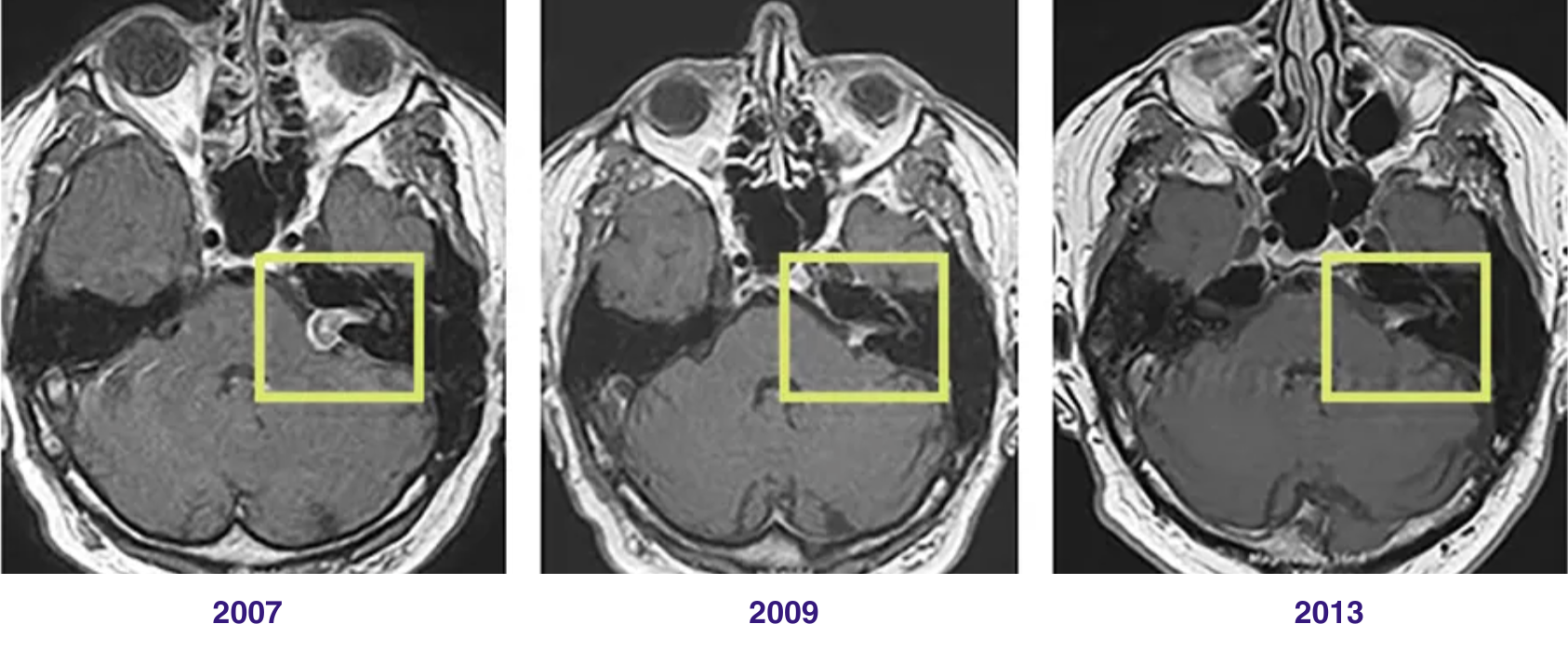 Im dargestellten Fall konnte durch die CyberKnife-Behandlung (Bild links) nicht nur das Tumorwachstum gestoppt werden, das Akustikusneurinom ist mit der Zeit auch deutlich kleiner geworden (Bild Mitte).