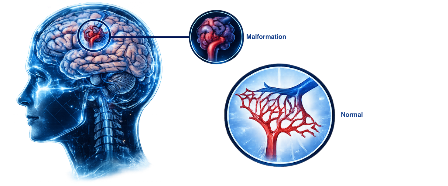 Als arteriovenöse Malformationen werden abnorme Gefäßfehlbildungen bezeichnet, die meist angeboren sind und in allen Regionen des Gehirns vorkommen können. Sie bestehen aus einem Nidus (lat. = Nest) – quasi einem Gefäßknäuel – von zuführenden Gefäßen (Arterien) und abführenden Gefäßen (Venen). Was diesem Gefäßknäuel allerdings fehlt, ist ein zwischengeschaltetes Netz kleiner Kapillargefäße, weswegen Arterien – einem Kurzschluss gleich – unmittelbar in die Venen übergehen.
