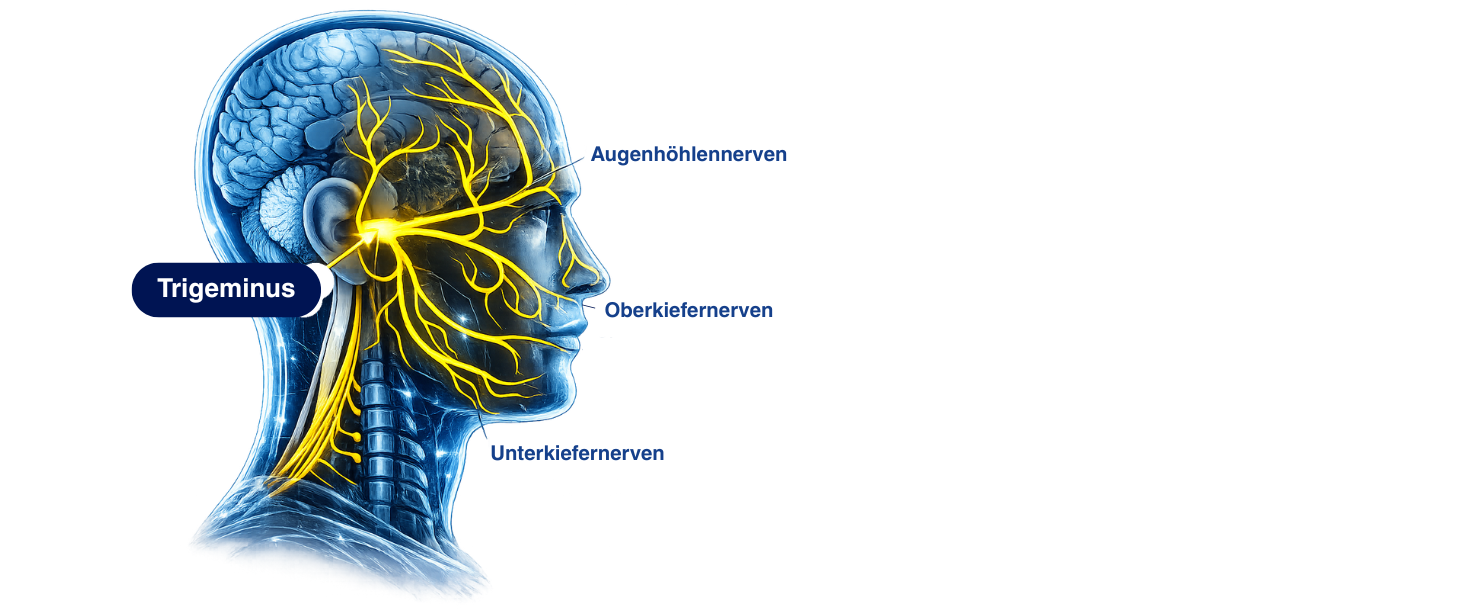 Der Nervus trigeminus ist dafür zuständig, das Gehirn über Empfindungen aus dem Bereich der Gesichtshaut zu informieren. Eine Funktion, die bei Trigeminusneuralgie gestört ist: Der Nerv meldet blitzartig stärkste Schmerzen an das Gehirn, obwohl die Haut völlig intakt und verletzungsfrei ist.