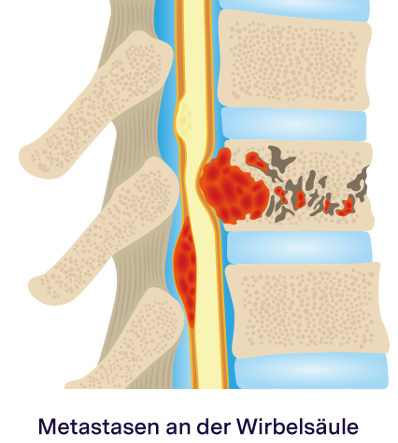 Entdeckte Krebsabsiedlungen im Bereich der Wirbelsäule sollten so schnell wie möglich behandelt werden, da die Metastasen auf das Rückenmark und Nerven drücken, dort zu Schädigungen und bis hin zu Lähmungserscheinungen führen können.