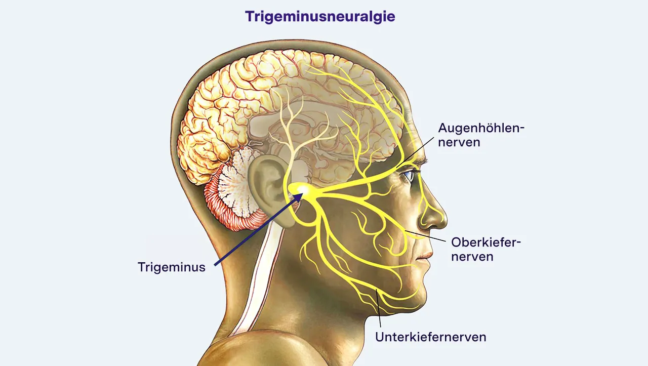 Симптомы могут быть вызваны, например, разговором, жеванием и глотанием, чисткой зубов или просто прикосновением к области, иннервируемой тройничным нервом. Это пятый черепной нерв, который разветвляется на три основные ветви: глазную, верхнечелюстную и нижнечелюстную. Он в первую очередь отвечает за ощущения на лице, но также, например, за жевательные мышцы.
