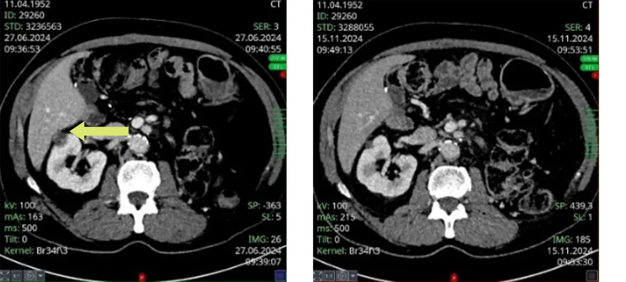 Слева: В этом случае 72-летнему пациенту с раком правой почки было проведено радиохирургическое лечение в июне 2024 года.